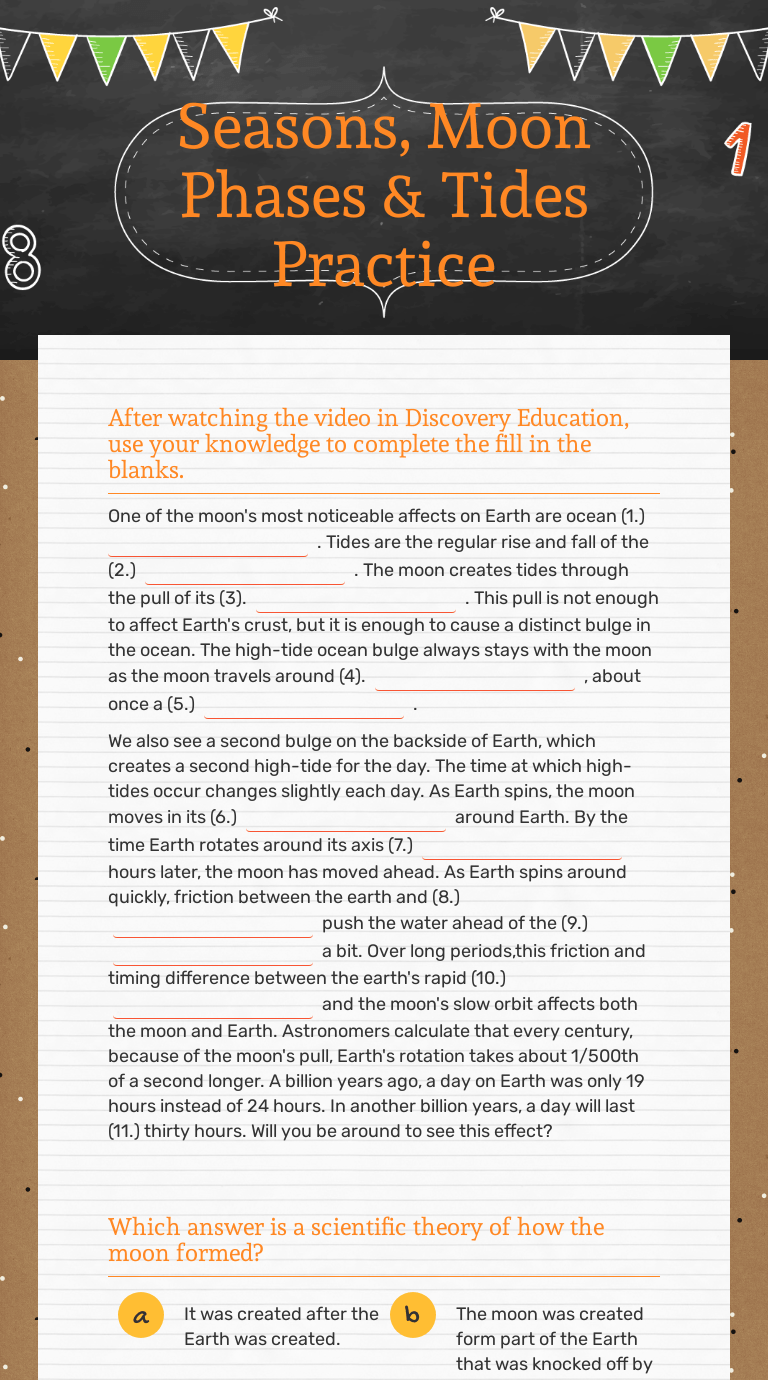 This snack models the equilibrium theory of tides, showing why there are two tide cycles per day,. Read a bit about how a moon is formed with this lunar lesson. Science worksheets · solar system activities in google apps and print . Tides to solve the puzzle. Neap tides occur during the and quarter 14.22lr)val.